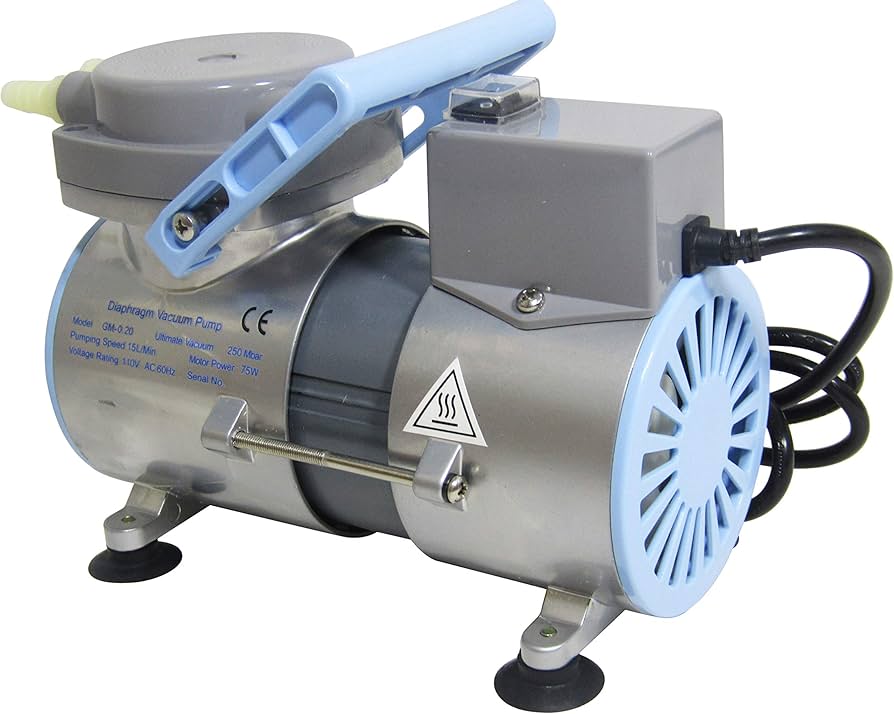 Bomba de vacío de membrana para prácticas educativas. Flujo 12 L/min, vacío 250 mbar, potencia 70 W. Útil en filtraciones y experimentos de ciencias en colegios de Chile.