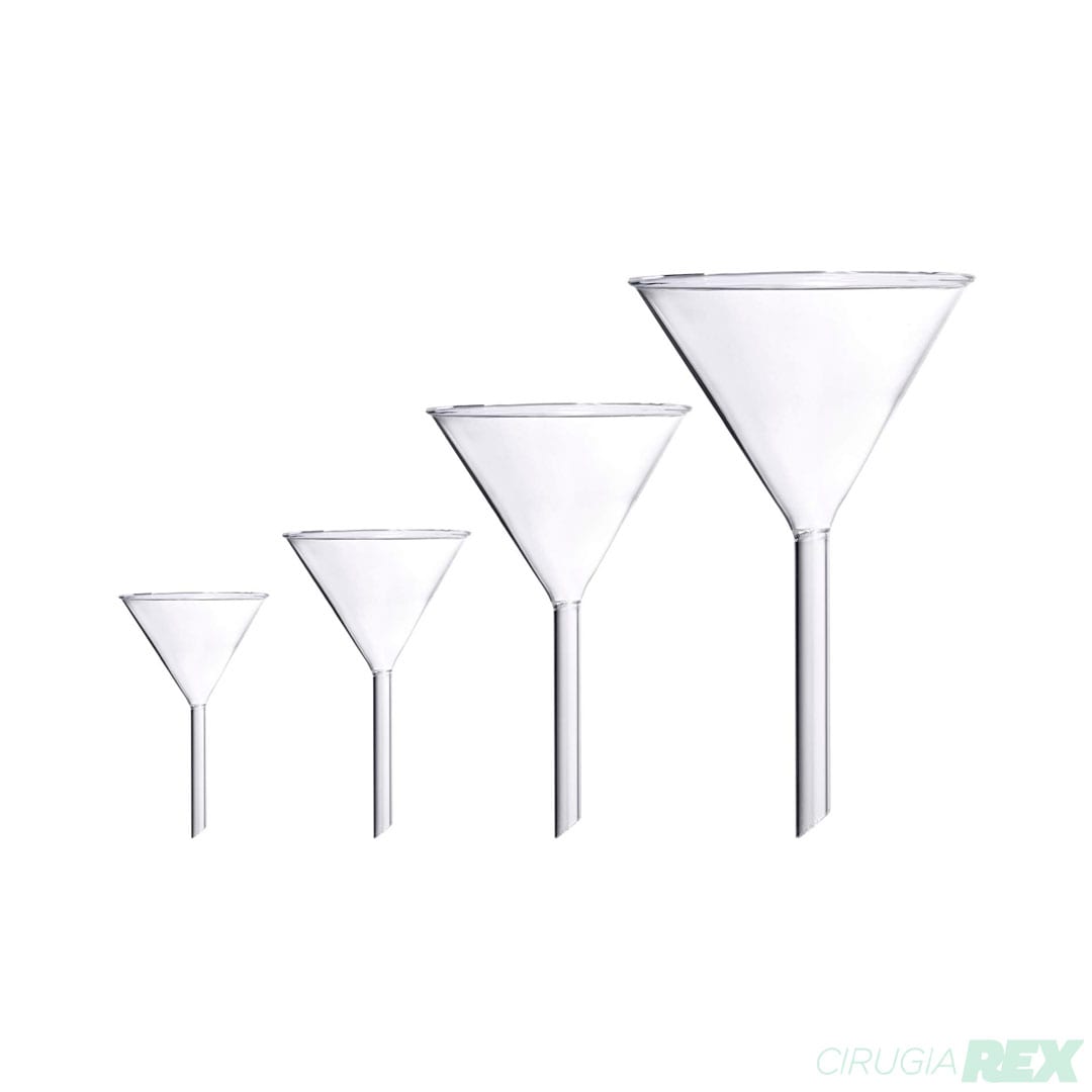 Embudo de vidrio para trasvasije y filtración por gravedad. Resistente a reactivos; cuello esmerilado opcional según modelo.