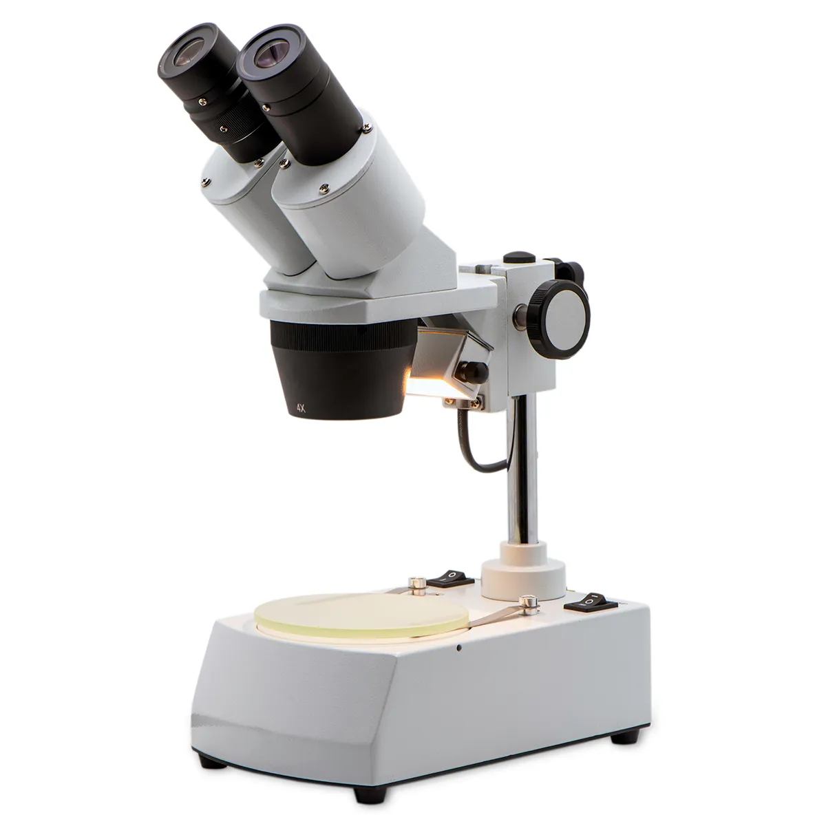 Lupa estereoscópica 20×/40× para observación tridimensional de muestras. Recurso de Biología y Ciencias Naturales en laboratorio escolar.