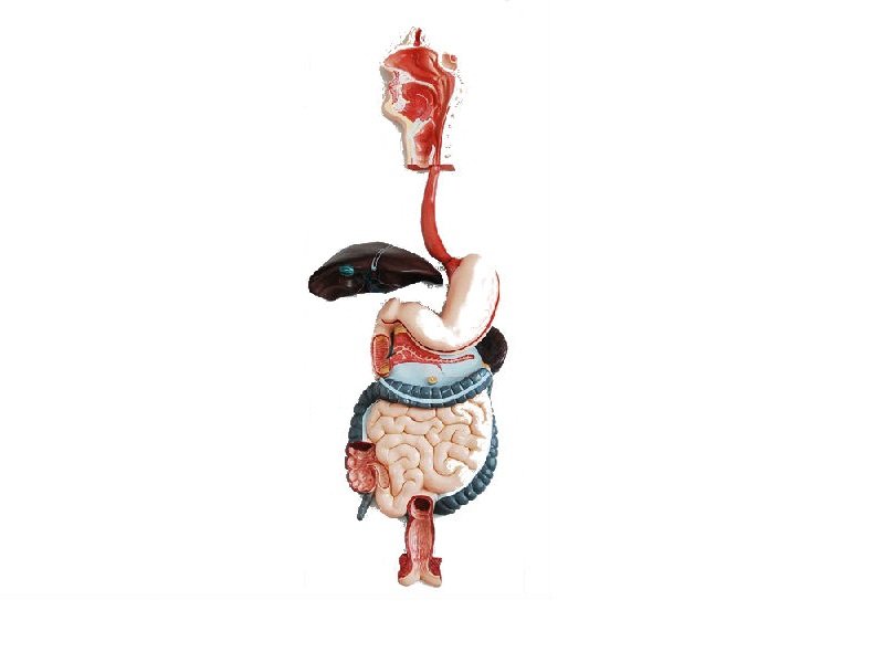 Modelo del sistema digestivo con órganos identificados. Favorece comprensión de funciones y trayecto alimentario en ciencias escolares.