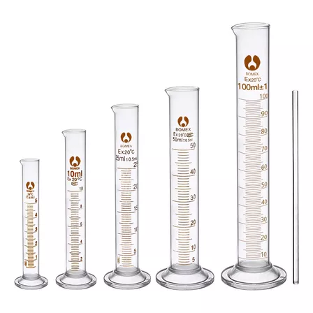 Probeta graduada de vidrio para mediciones precisas. Resistente a temperatura; base sólida.