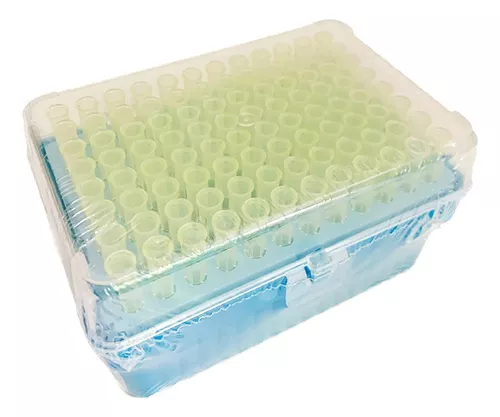 Contenedor con 96 puntas amarillas, ideal para dosificaciones precisas en laboratorio.