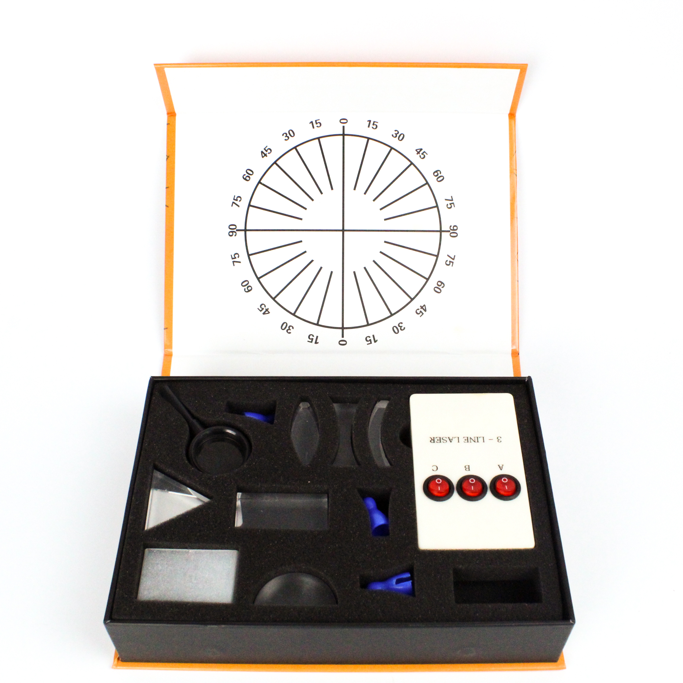 Set demostrativo de óptica con 7 piezas para estudiar reflexión, refracción, lentes y formación de imágenes. Ideal para laboratorio escolar y actividades de Física, favorece el aprendizaje visual y el método experimental.