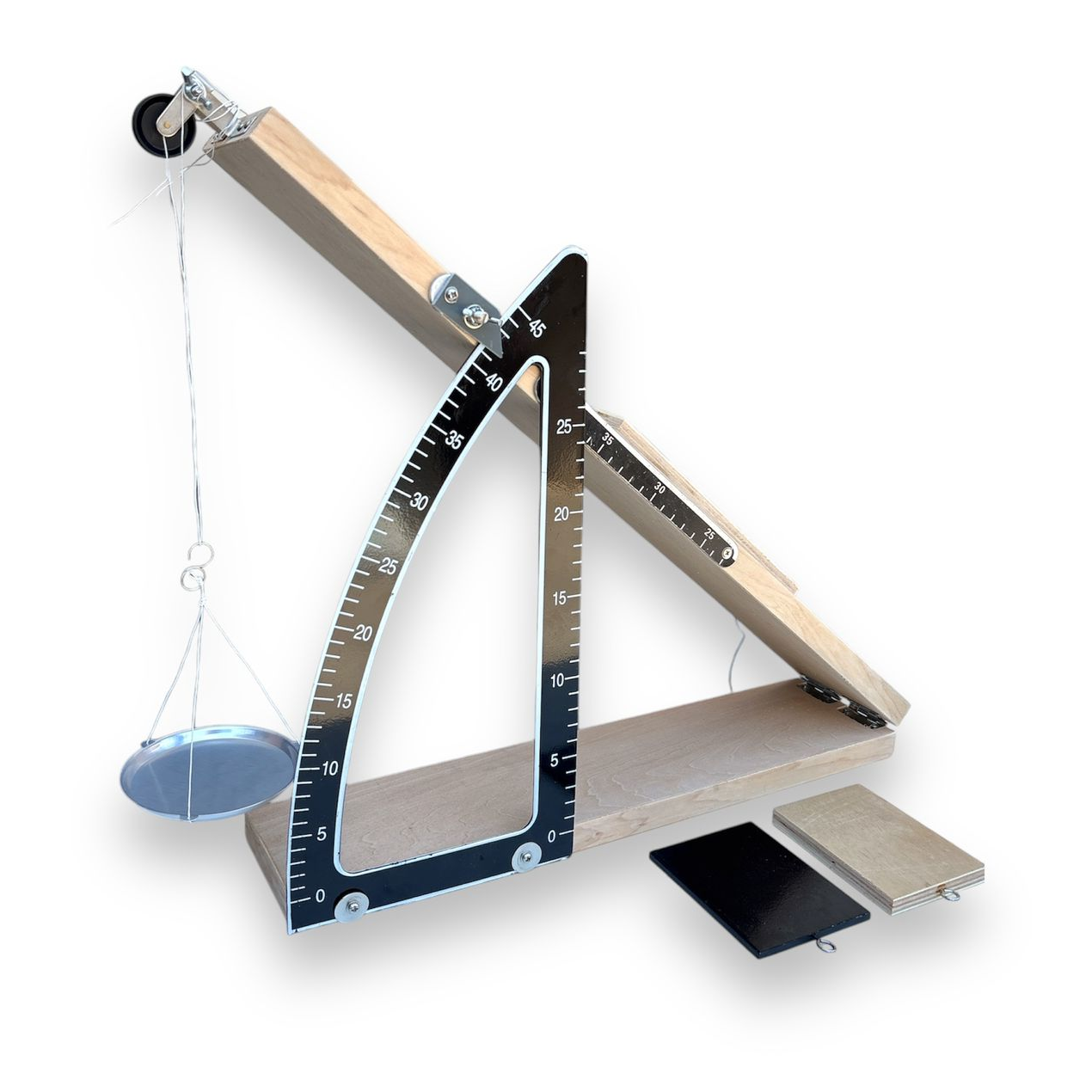 Kit de plano inclinado para analizar movimiento, energía y fricción. Recurso de Física escolar que permite mediciones controladas y experimentos comparativos en laboratorio y aula.