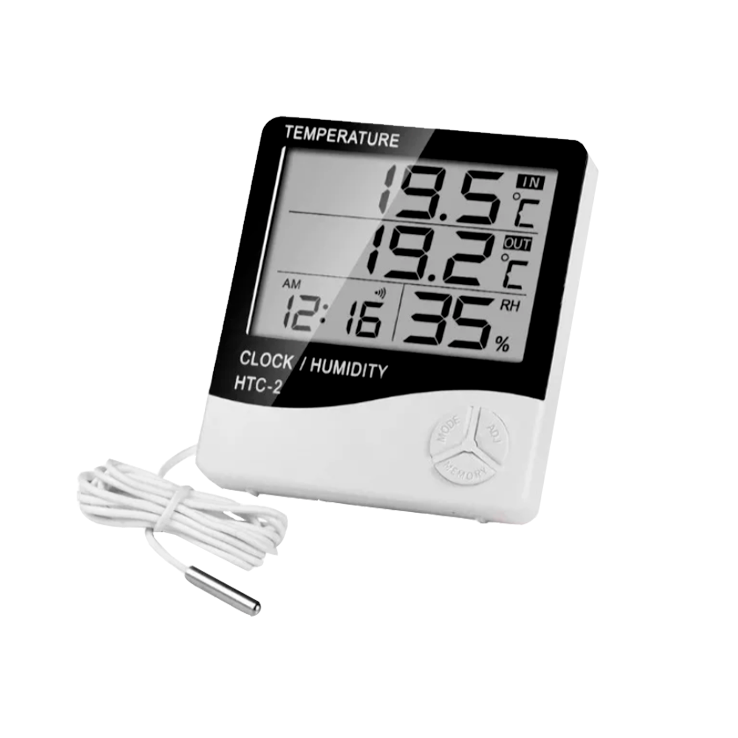 Termómetro–higrómetro digital con LCD para monitorear temperatura y humedad. Recurso didáctico para laboratorios escolares y proyectos de ciencias ambientales en aula.